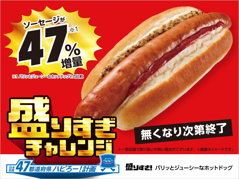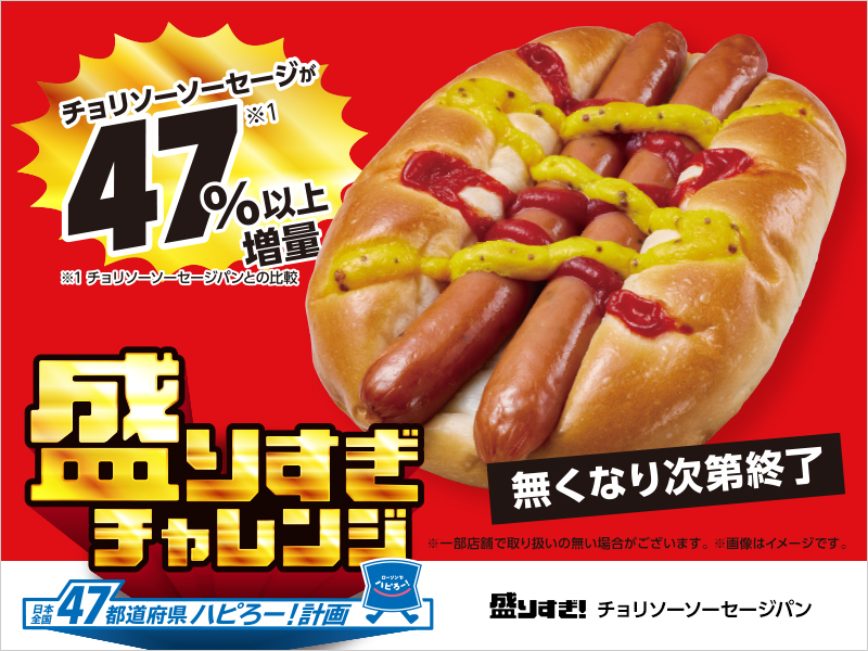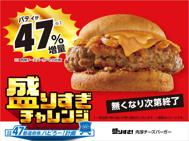 ローソン「盛りすぎチャレンジ」第3弾、“47%増量”肉厚チーズバーガー/ホットドッグ/シュークリーム  ローソンは「やりすぎチャレンジ」と題して「●●すぎる」商品を続々と発売している。第3弾は47%増量した「盛りすぎチャレンジ」商品を2月21日~27日に販売する。 盛りすぎ! 肉厚チーズバーガー 価格: 397円 ※ナチュラルローソンでは販売しない 特徴: パティ47%増量。オニオンスライス、チーズソースも増量した、ずっしりボリューム満点のハンバーガー 盛りすぎ! パリッとジューシーなホットドッグ 価格: 192円 ※ナチュラルローソンでは販売しない 特徴: ソーセージ47%増量。ケチャップも増量してよりジューシーに 盛りすぎ! チョリソーソーセージパン 価格: 117円 特徴: 旨辛なチョリソーソーセージを通常品に対して2本に増量。より肉感が楽しめるボリューム満点の惣菜パン ※沖縄エリアでは「あらびきソーセージ」2倍商品 チョリソーソーセージが47%以上(2倍)増量「盛りすぎ! チョリソーソーセージパン」(117円) 盛りすぎ! 生カスタードシュークリーム 価格: 160円 ※2月20日夕方ごろ発売 特徴: 総重量が47%増量。プレミアムエッグを使用したカスタードが通常量の1.47倍 https://gourmet.watch.impress.co.jp/docs/news/1479942.html