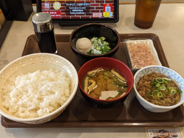 牛小鉢と半熟玉子とオクラだけで下手な弁当より良い。温かいごはんと味噌汁付けて店内で食べれて420円は安すぎ。