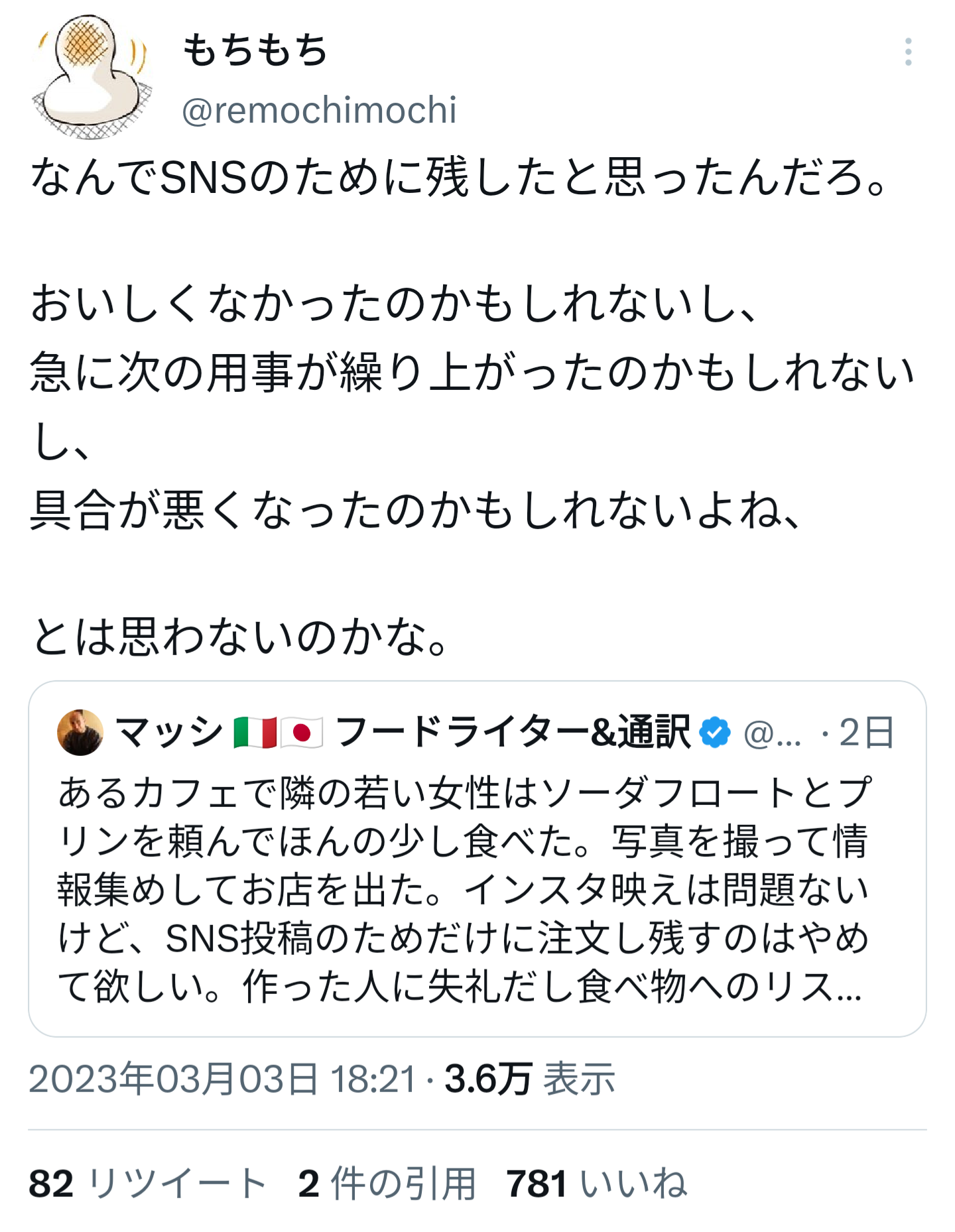 身の安全だの味が~だの実際にあった事前提でリツイートしてるんだからもうその段階の話じゃないぞ
