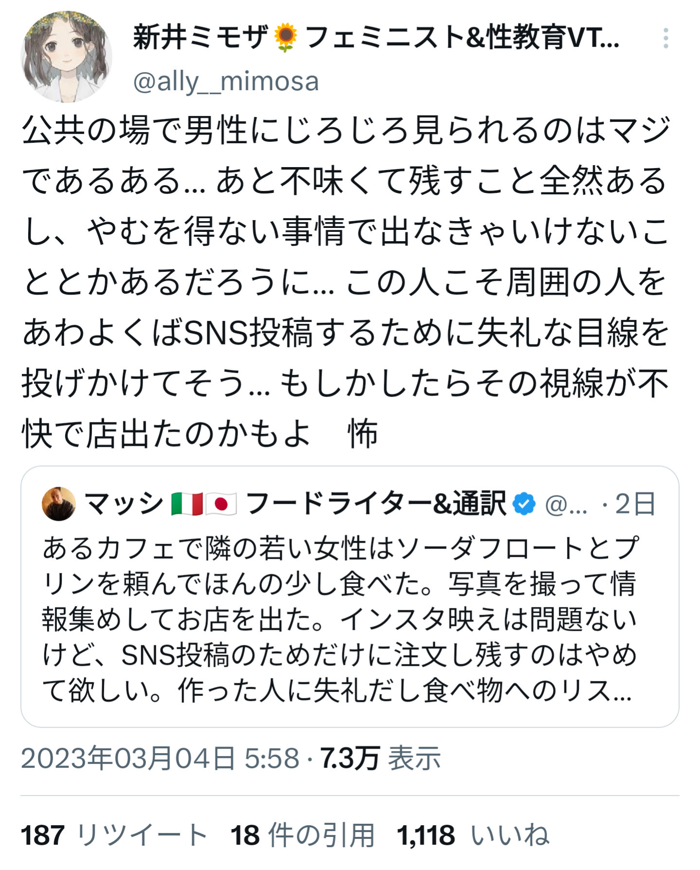 ジロジロ見たっていうのは、スイーツ脳インスタ蝿が同族を擁護するための被害妄想でしょ。笑😃