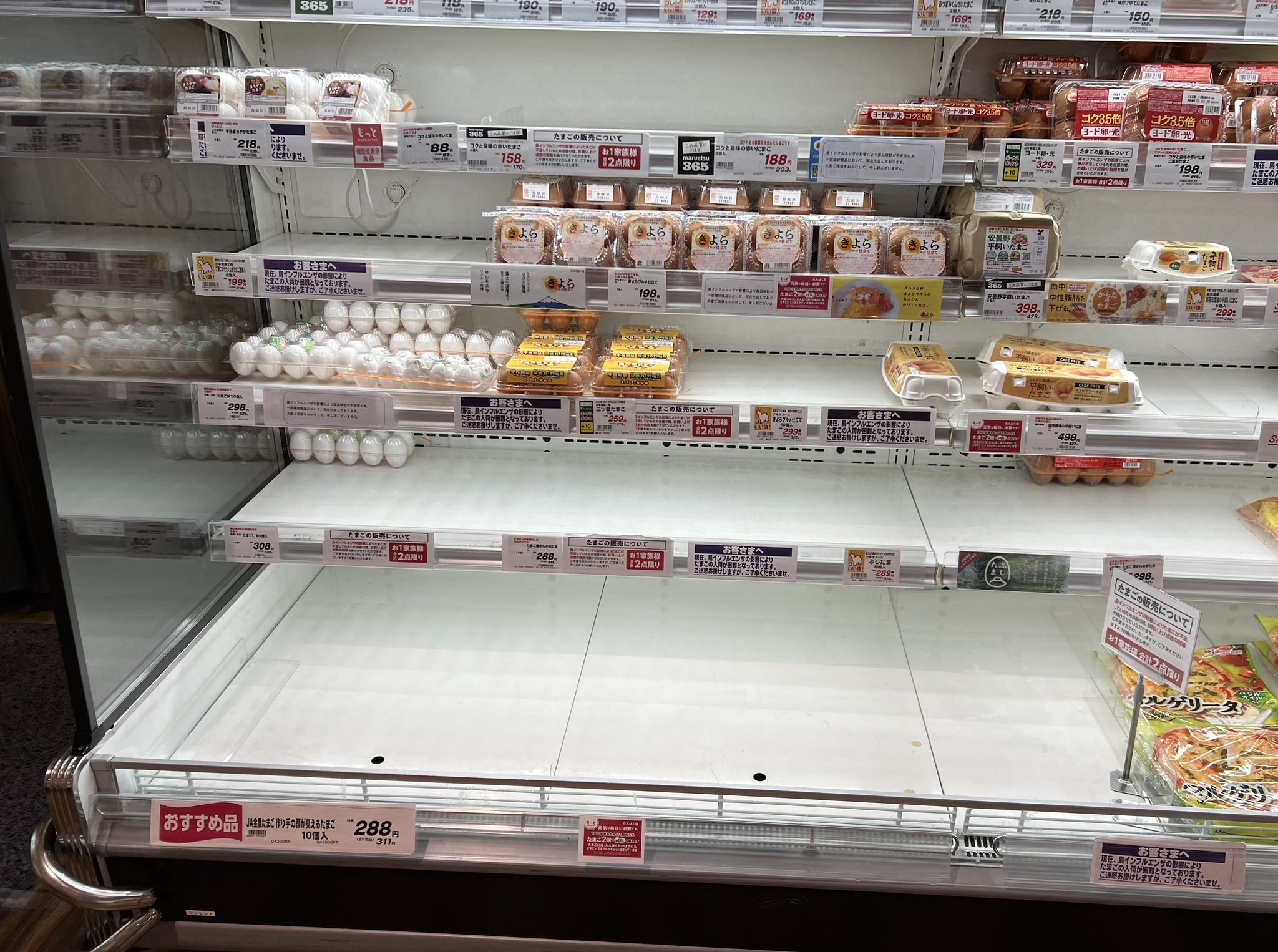 ちな東京。売り場の卵の数が激減しているのな。過去の納豆騒動もそうだったが、毎日食べるものが値上がり程度は仕方がない。だが、買えなくなりそうな感じに不安を覚える。