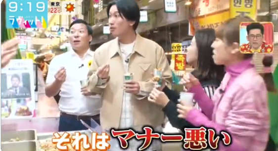 一緒にロケしていた「3時のヒロイン」福田麻貴から「ダメダメ、それはマナー悪い」、タレントの若槻千夏から「絶対ダメ」とすかさずツッコまれた。タッカンジョンを売る男性店主も、両手をクロスさせててNGを示すバツポーズを取って山添に注意した。