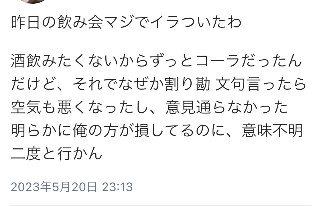 酒飲みたくないのに飲み会行ってるこいつが悪いやろ