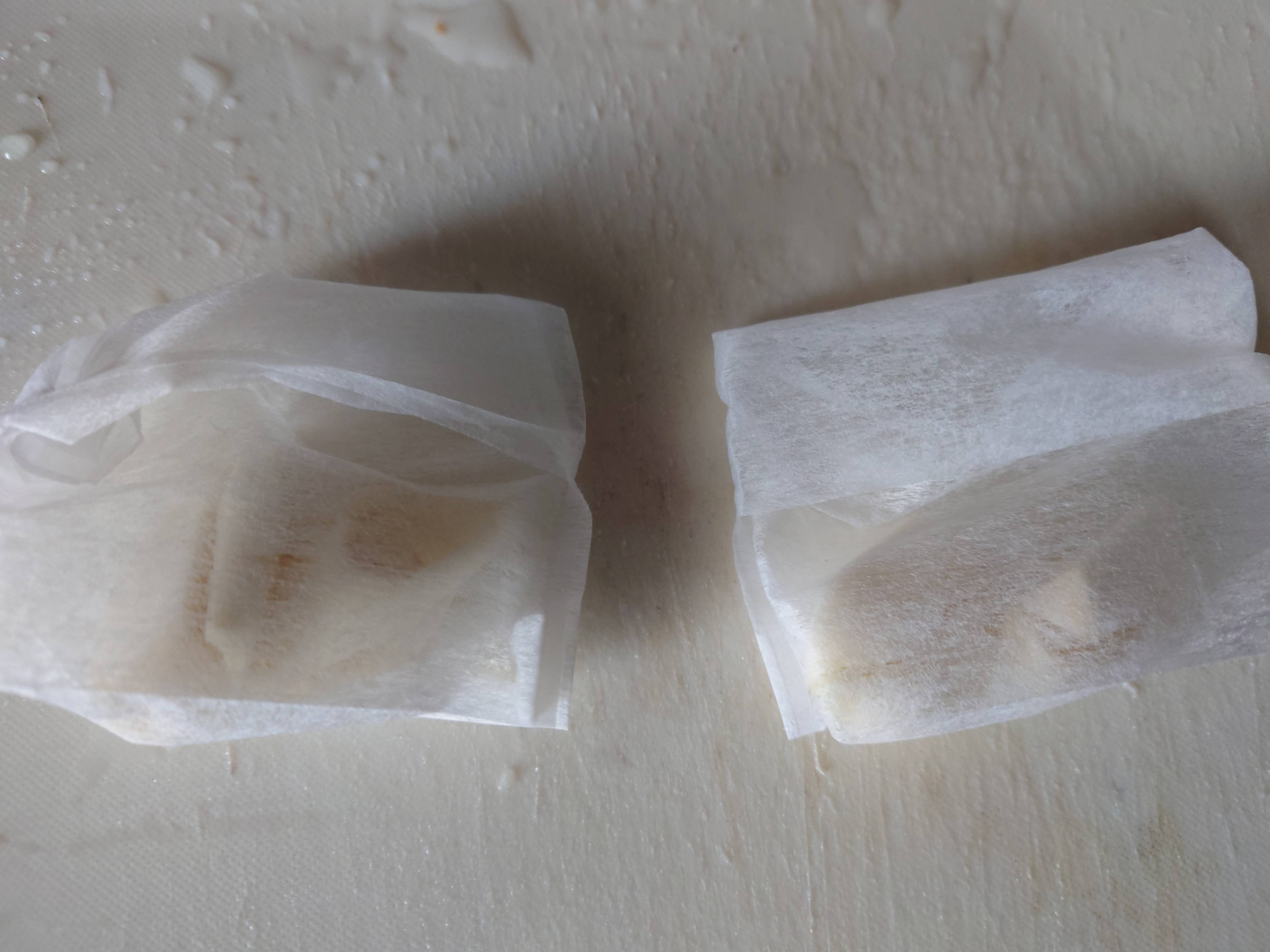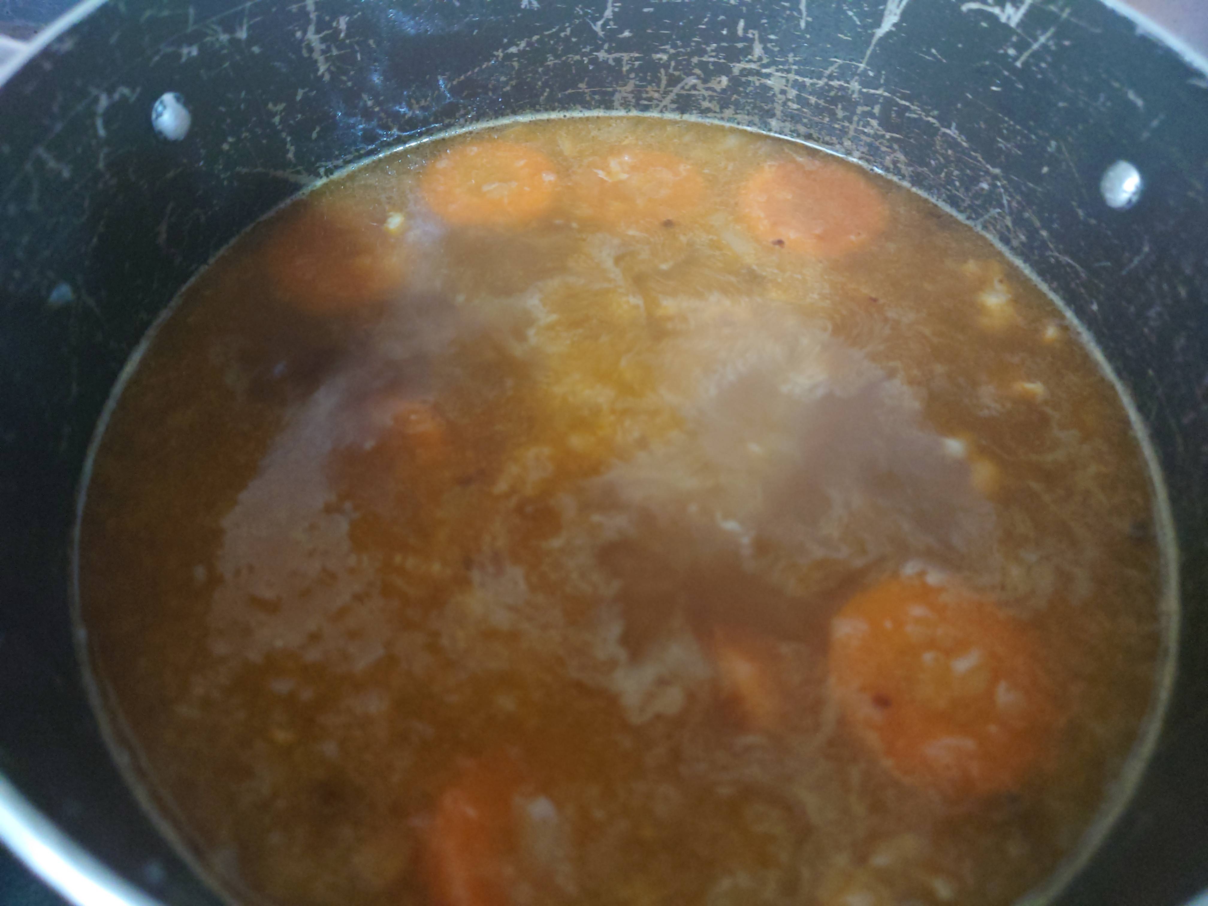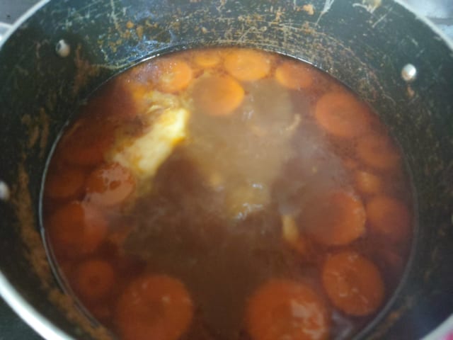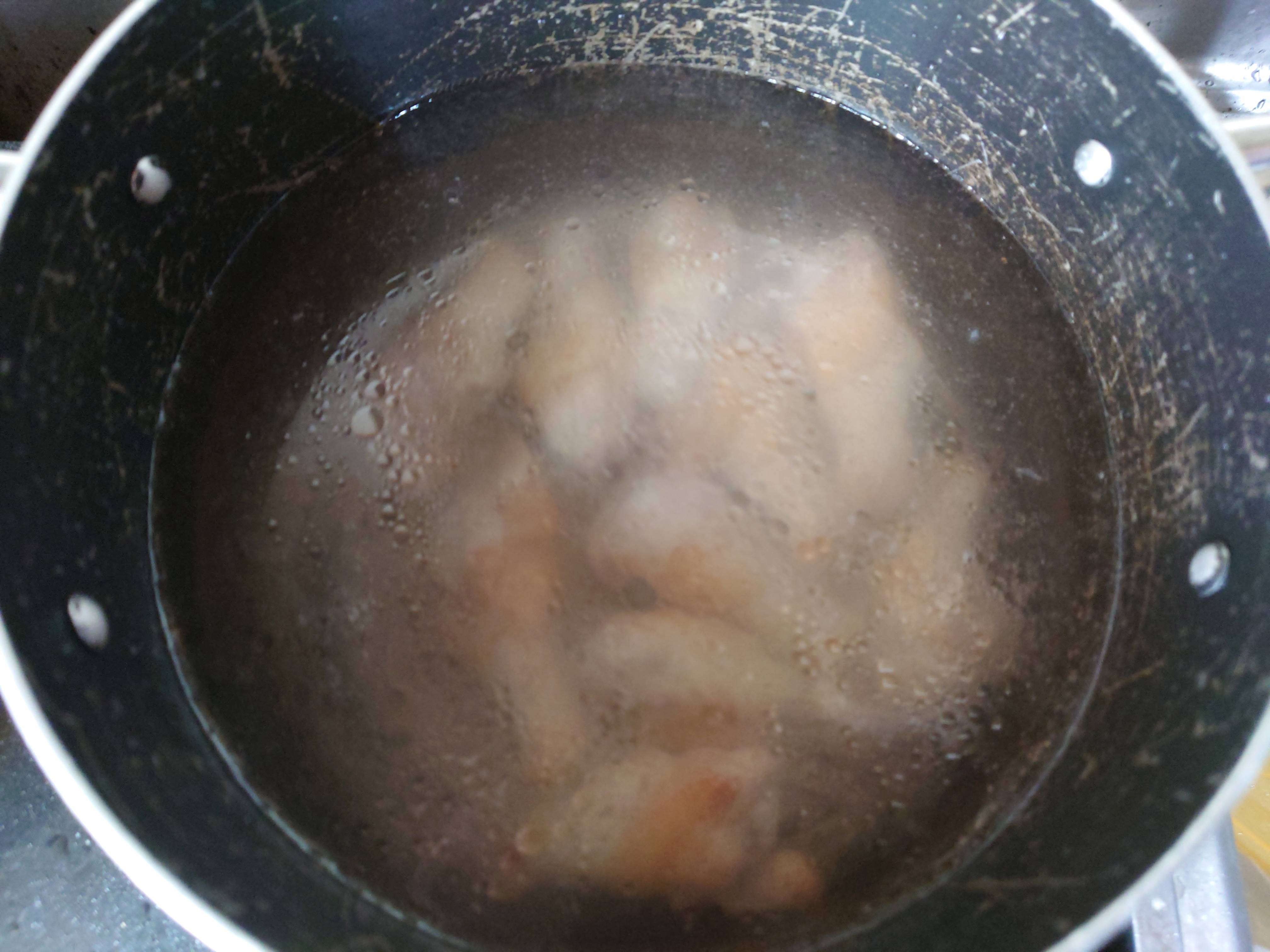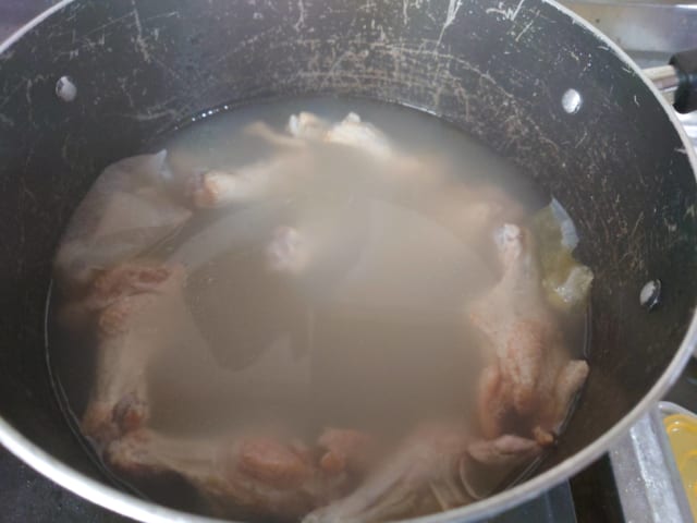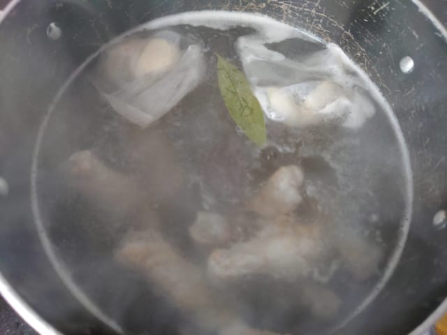 ニンニク茶パックとローリエの葉を入れて煮込んでくで