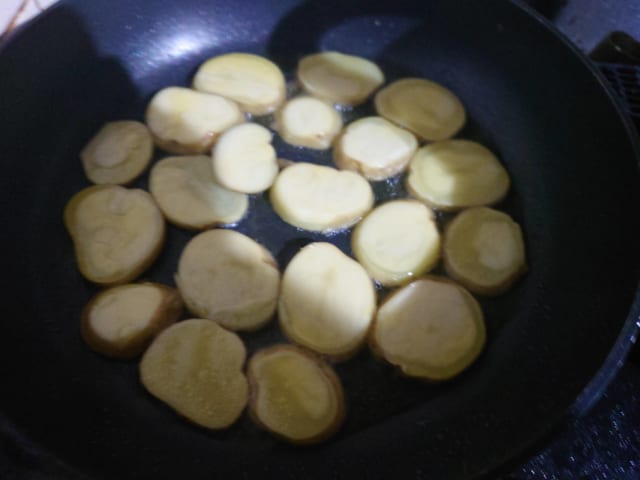 ここは敢えての皮付きのまま少し厚めにスライスして、オリーブオイルで焼いてくで