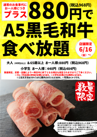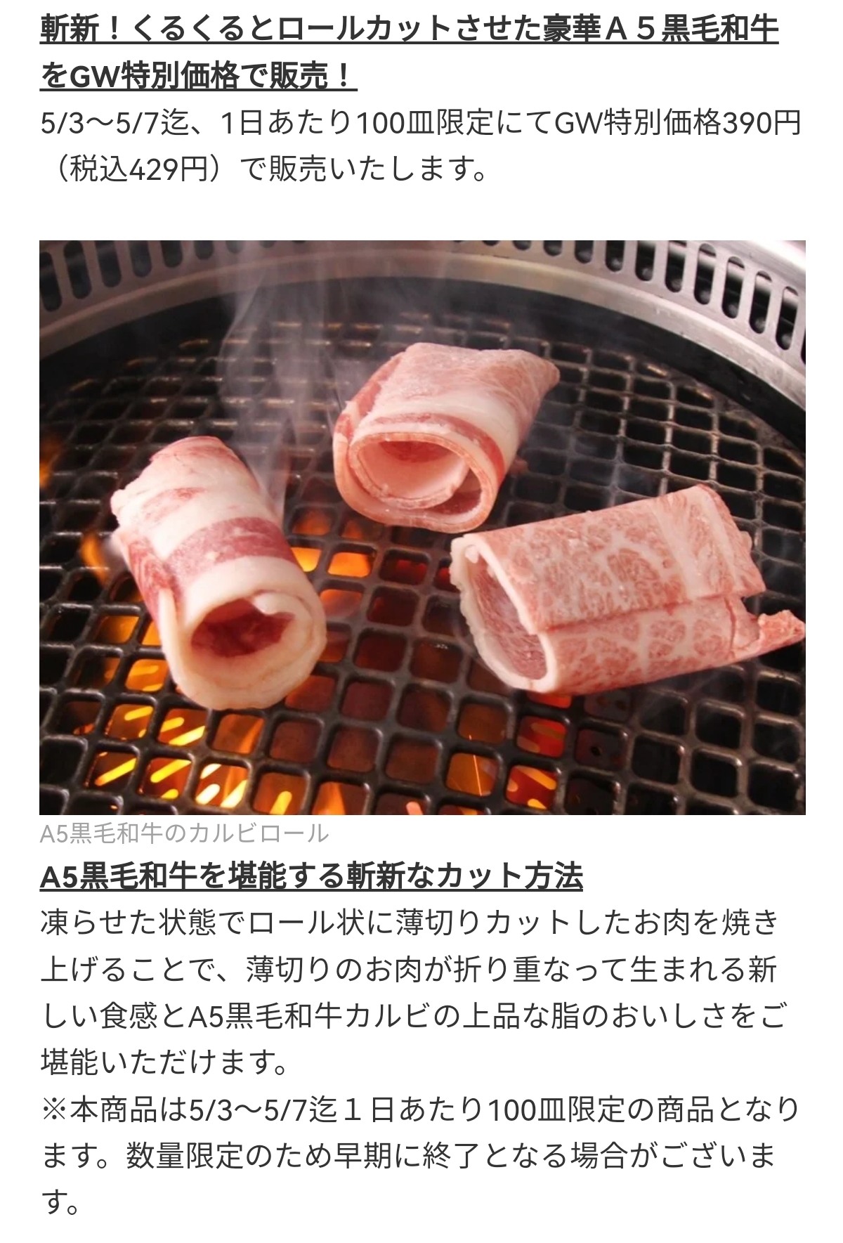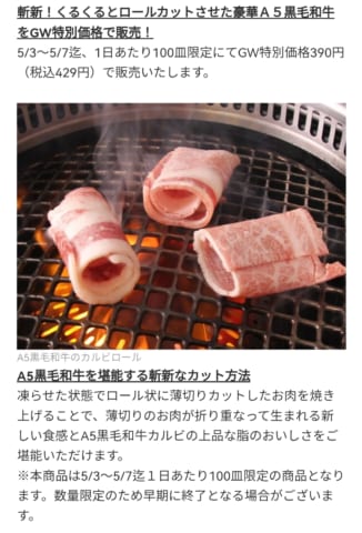>また、A5ランクの黒毛和牛ロールは、1皿(5ロール)で605円で単品販売する(通常の食事も注文すること)。