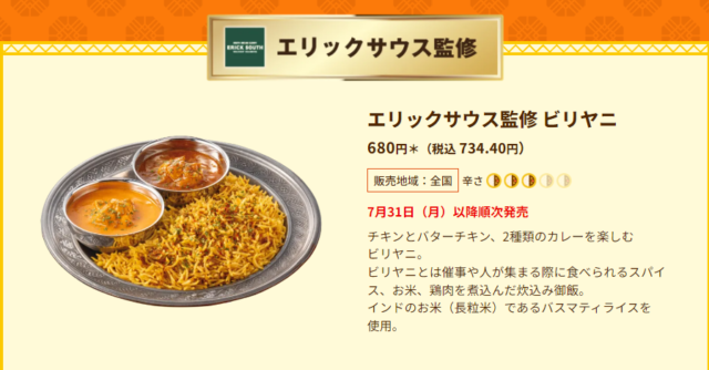 2023年07月31日の第2弾 エリックサウス監修 ビリヤニ バスマティ米使用 チキン&バターチキンカレー 680円(税込 734.40円)