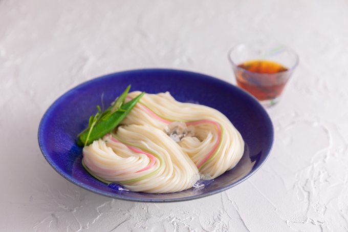 担当者は、「ひやむぎとそうめんは見た目では区別しにくく、『色付きの麺が入っているのはひやむぎですよ』と、お客さまに提示するためです」と説明する。 pic.twitter.com/xfQsxAx0mP