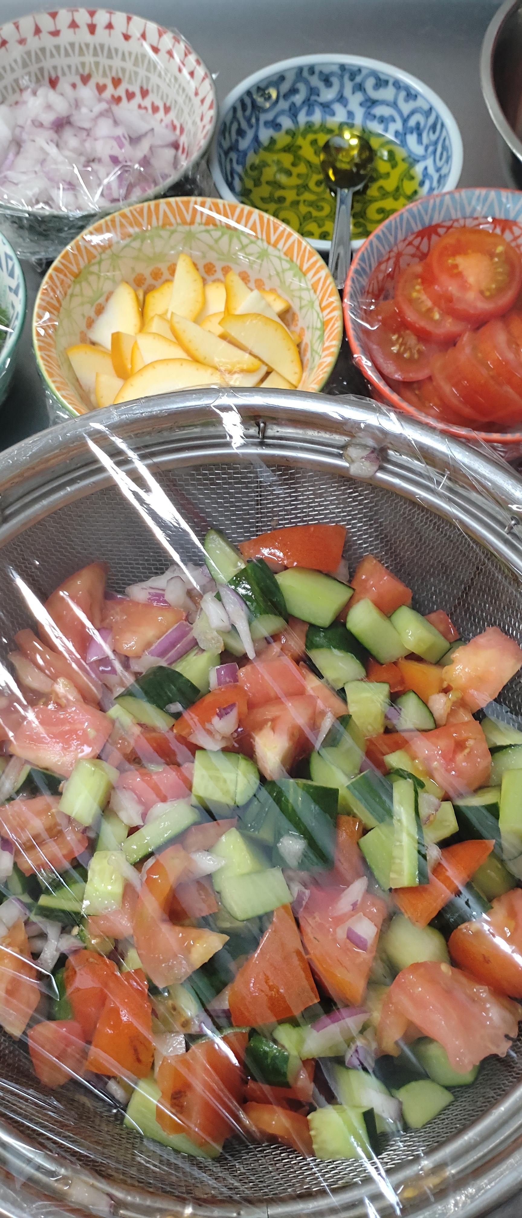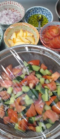 胡瓜、トマト、ゴーヤ、全部一口大に切って麺つゆに漬け込んでる。
