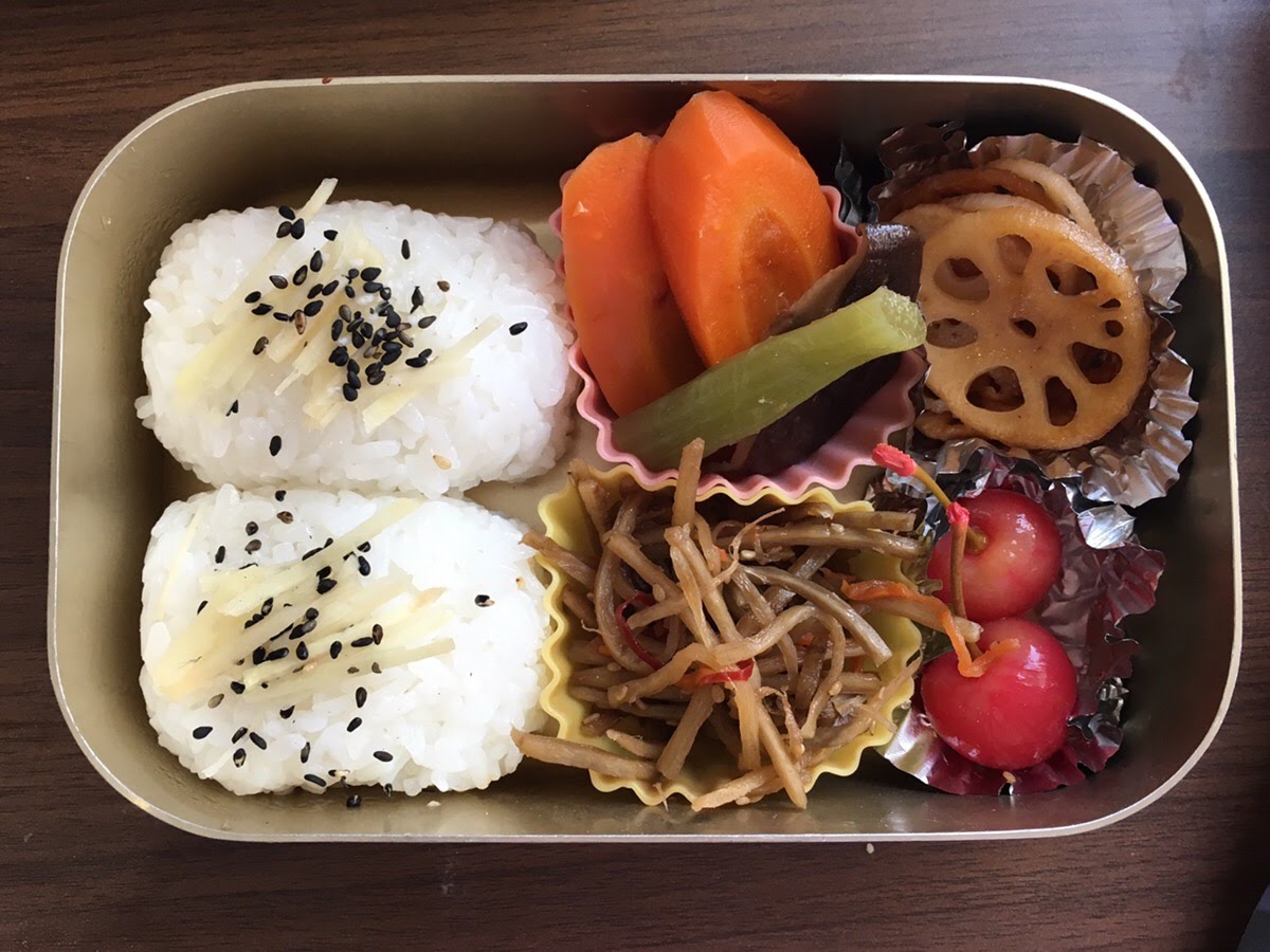 おにぎり 刻みしょうが ごま(ごま塩) にんじん 山椒(さくらんぼ) しいたけ ごぼう れんこん 筋の通ったふき