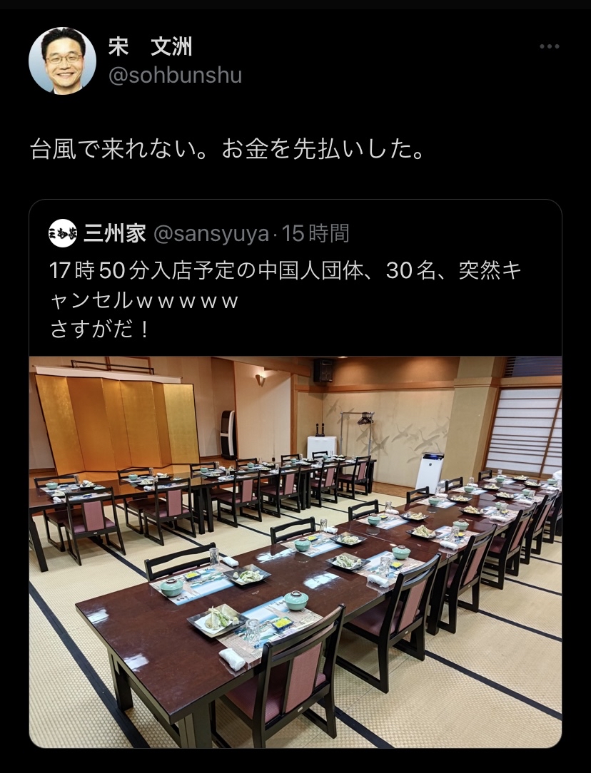 墨田区の三州屋、「中国人団体客が突然のキャンセル!さすが」と投稿→炎上(代済み、台風の影響)
