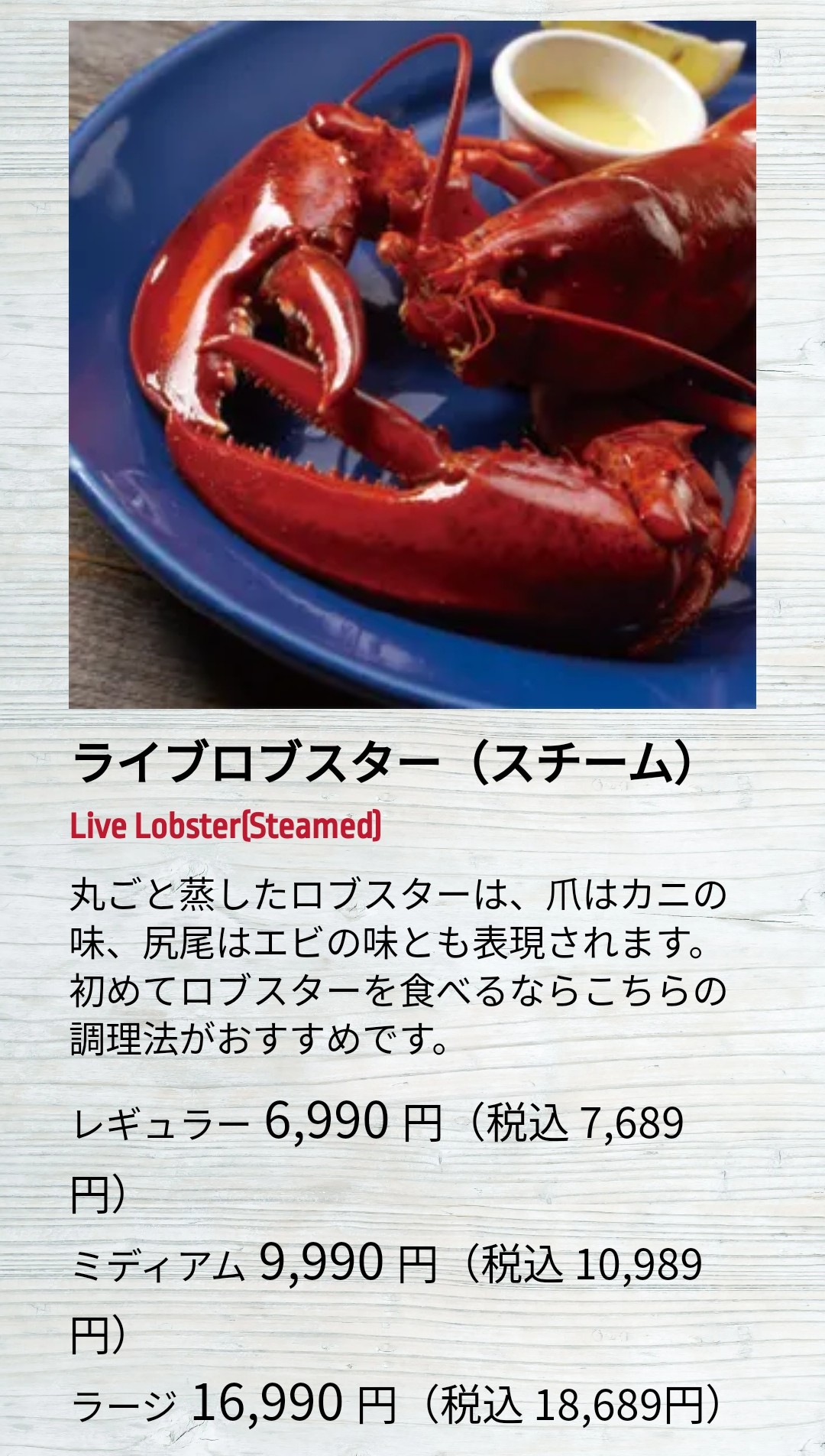 生け簀の持ってきて見せてから調理してくれるライブロブスター懐かしい。爪の部分が一番美味しかったぁ。うちの方の店舗は消えました。