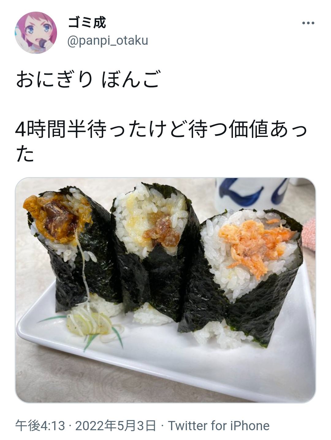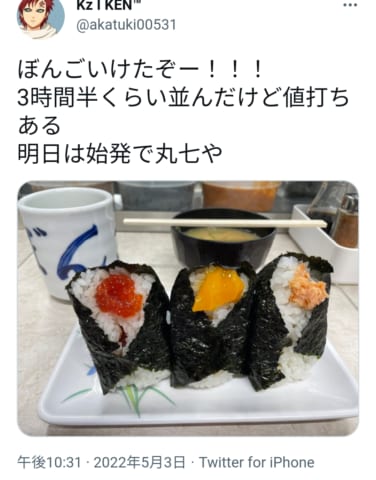 並ぶのが楽しいってことあんのは分かるけどアトラクションでもないただの握り飯に3時間も並べんわ