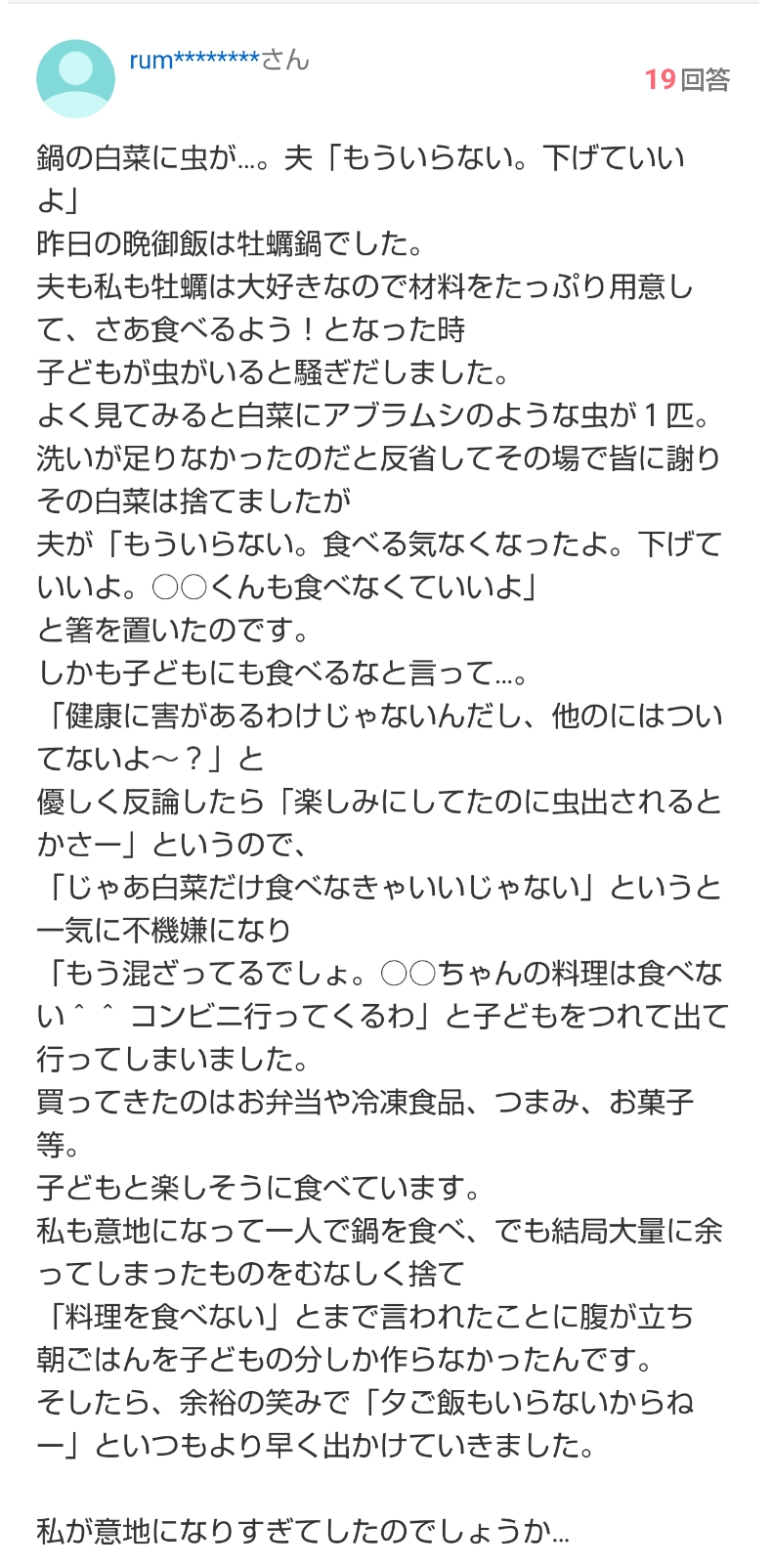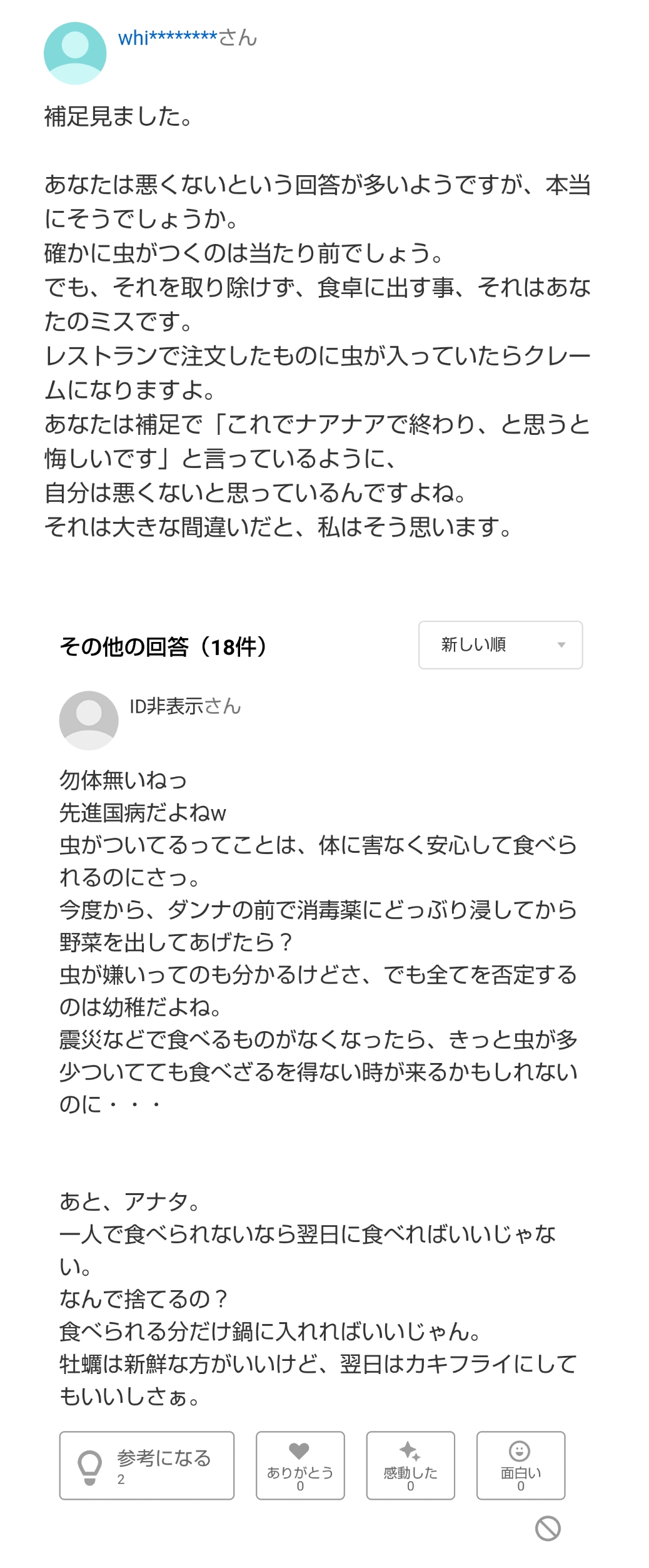 【悲報】息子「カキ鍋の白菜に虫がいる!」夫と妻どちらが悪いか激論に