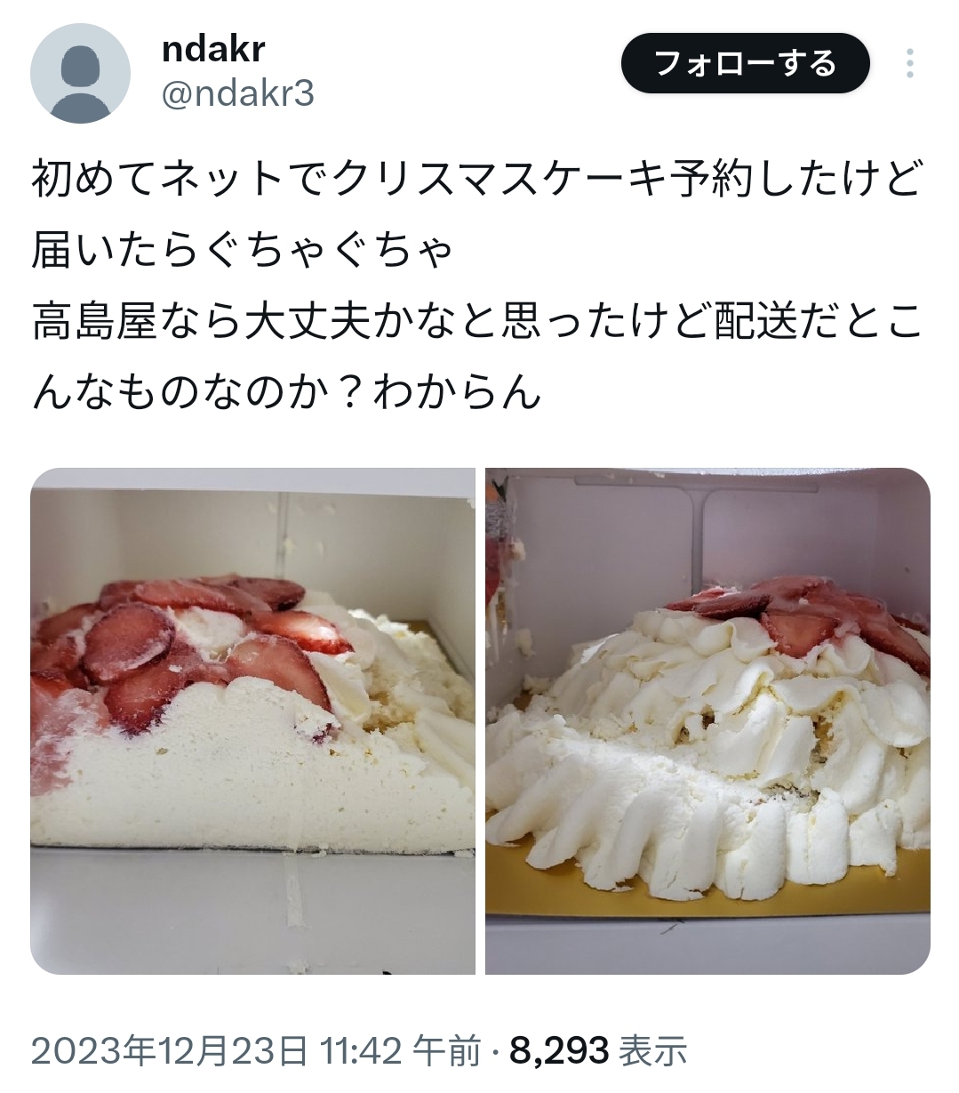 Xで“冷凍ケーキは解凍に時間かかるからこれだけ溶けてるのは相当放置されてたということ”ってコメントでハッとした