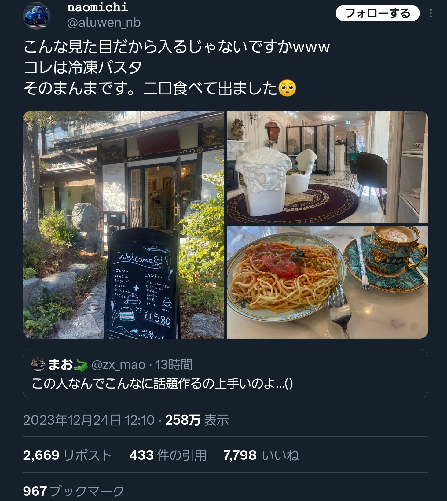 【悲報】京都のオシャレカフェ、冷凍パスタを提供してしまうwwwww