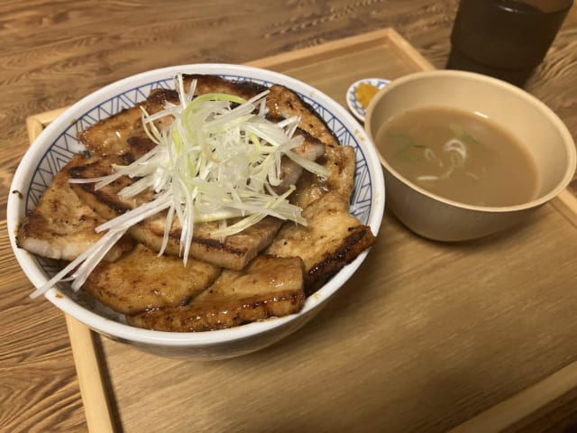 (なりません。出汁で軽く炊いた厚切り豚肉とハイカラ丼もどきです)