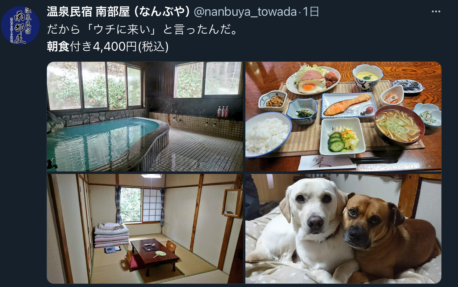 犬とはそんなに触れ合えないらしいよ、旅館の主が一緒じゃないと無理だって