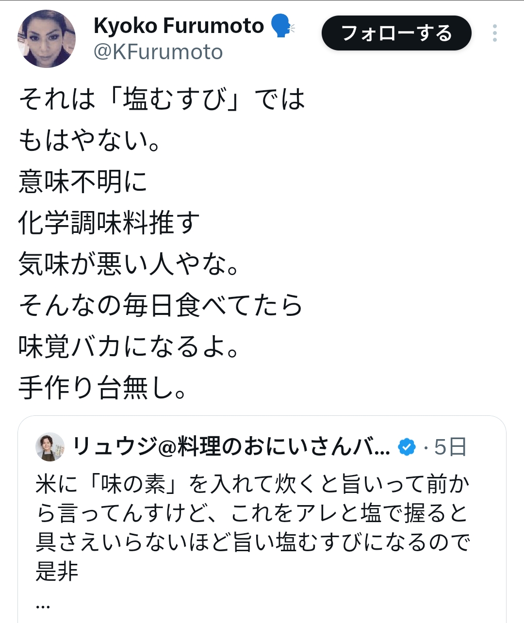 味の素入れるのはリュウジ信者が具なしでおにぎり食べるための手順のひとつだろ?