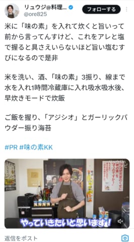 【悲報】料理研究家リュウジさん、ご飯にいつも通り味の素を入れて炊いただけでいつもの連中にネチられる