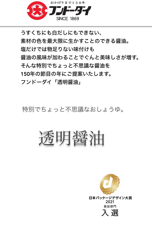 うすくちにも白だしにもできない、 素材の色を最大限に生かすことのできる醤油。 塩だけでは物足りない味付けも 醤油の風味が加わることでぐんと美味しさが増す。 そんな特別でちょっと不思議な醤油を ​150年の節目の年にご提案いたします。 ​​フンドーダイ「透明醤油」 ​特別でちょっと不思議なおしょうゆ。 透明醤油