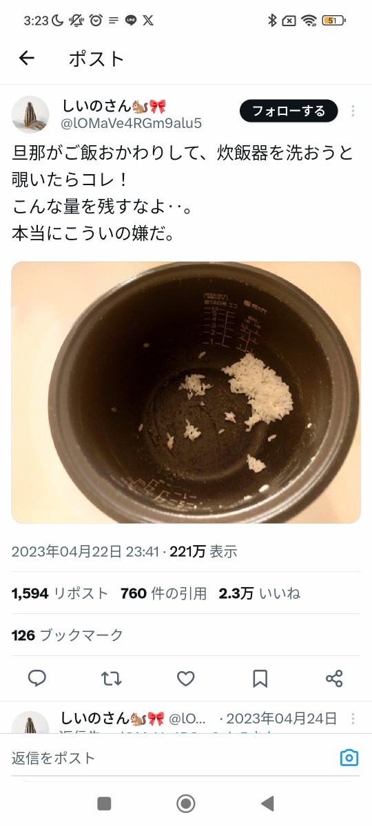 女さん「炊飯器にある飯半端に残すな😡」彡(●)(●)「!!!!なにがあかんの??」