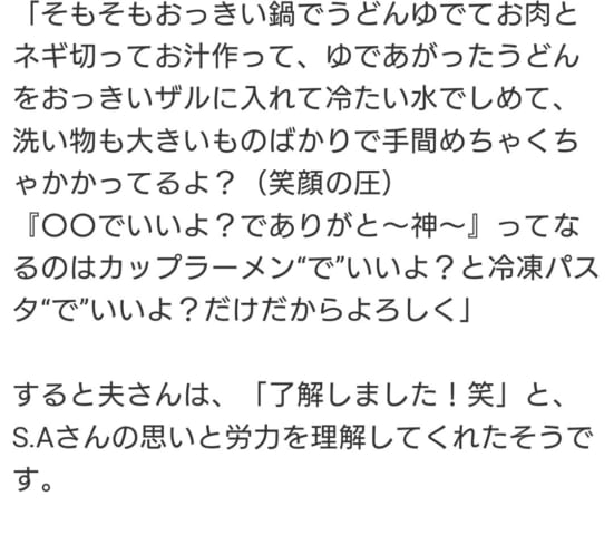 うどんとか簡単な物すら文句言われるなら飯は作らなくていい(嫌な気持になるだけ)