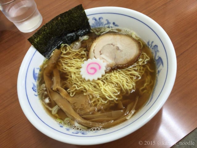 森堅太郎が支那で覚えた拉麺の作り方を元に開発。黄金色がかった澄んだスープに平麺のラーメンだ