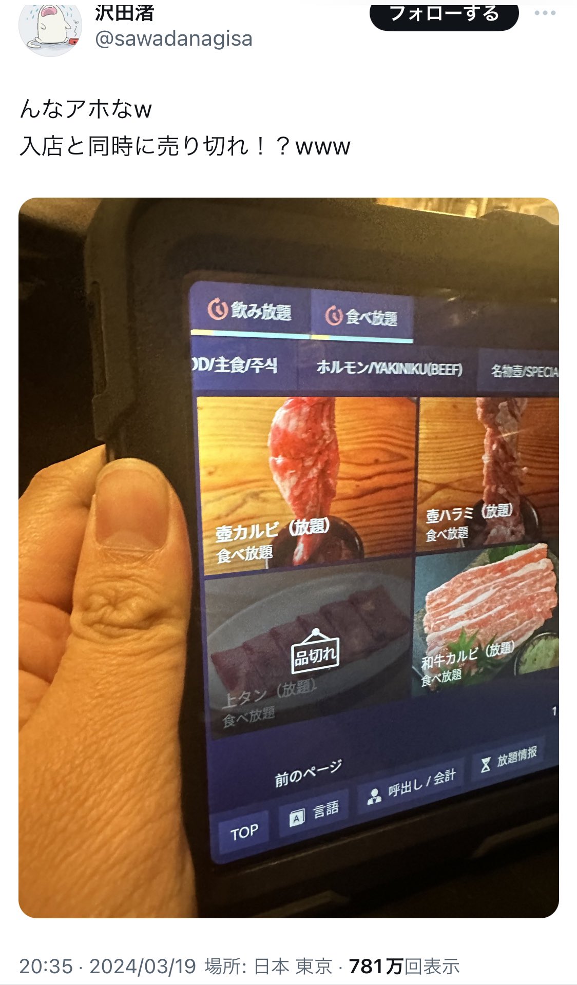 ラストオーダー間際に5人前、ラストオーダーでさらに5人前の上タンの注文が来ましたが、店舗の上タンの在庫がなくなり、お客様に品切れの旨をお伝えしました。
