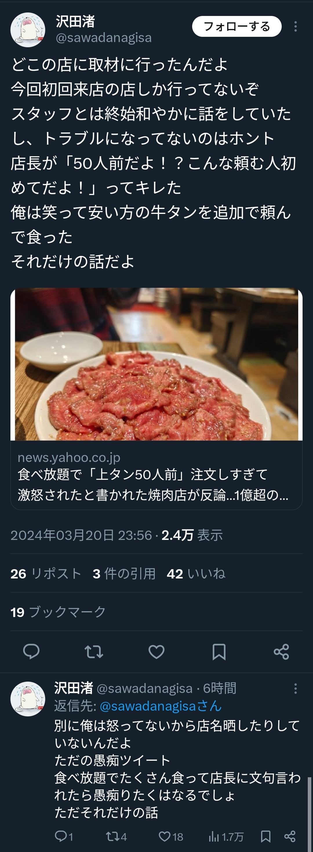 ワイはこれくらいで対応できない店が悪いって店を叩いてたから良くないけど