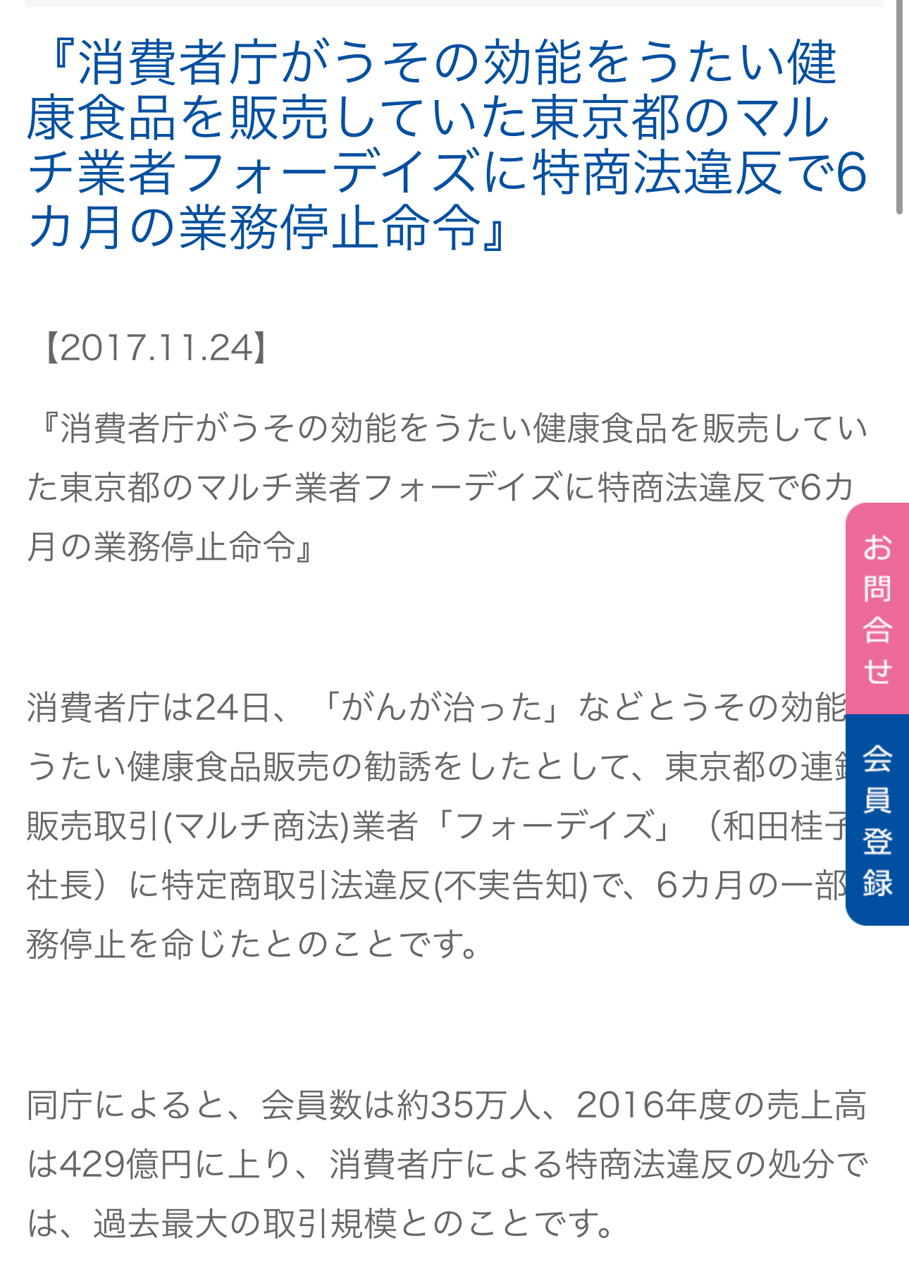 フォーデイズって数年前消費者庁から行政処分受けてるしマルチだの関連ワード出てくるしアカン所やん