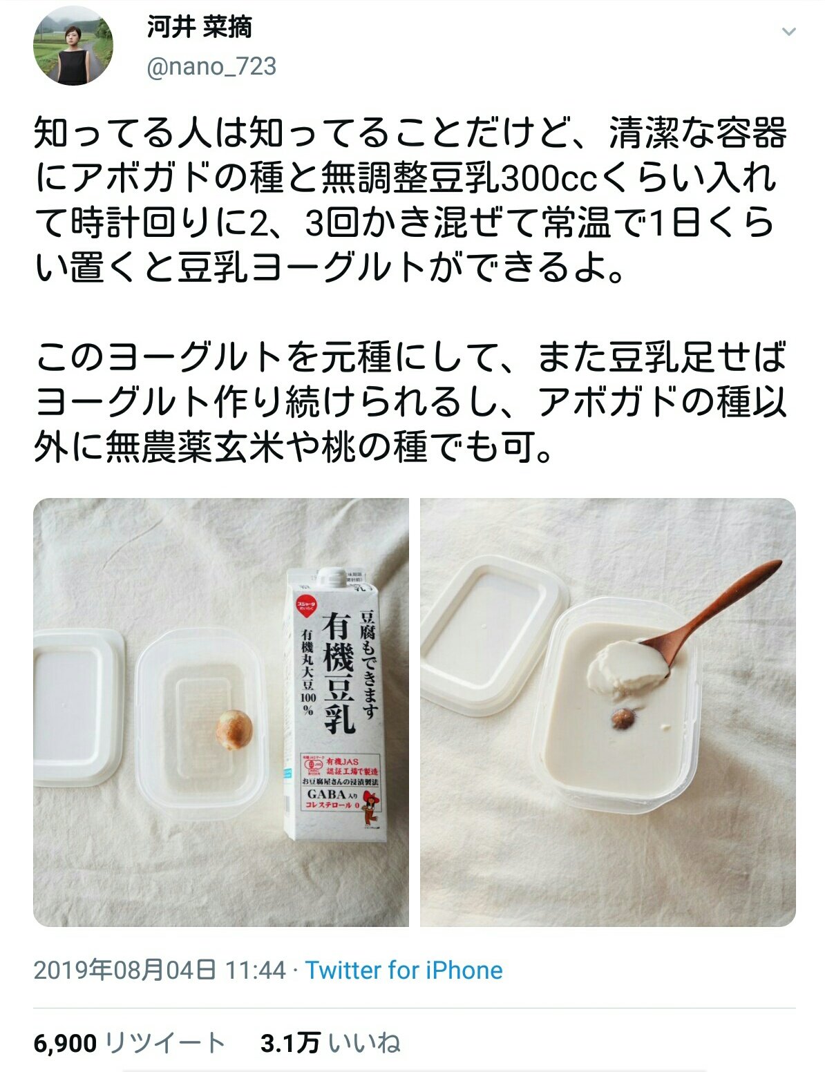 豆乳ヨーグルトの何が滑稽かって、清潔な容器を用意してるにもかかわらず無知なせいで1日豆乳を常温で放置するという矛盾した行為をしているのに気付かない所よ