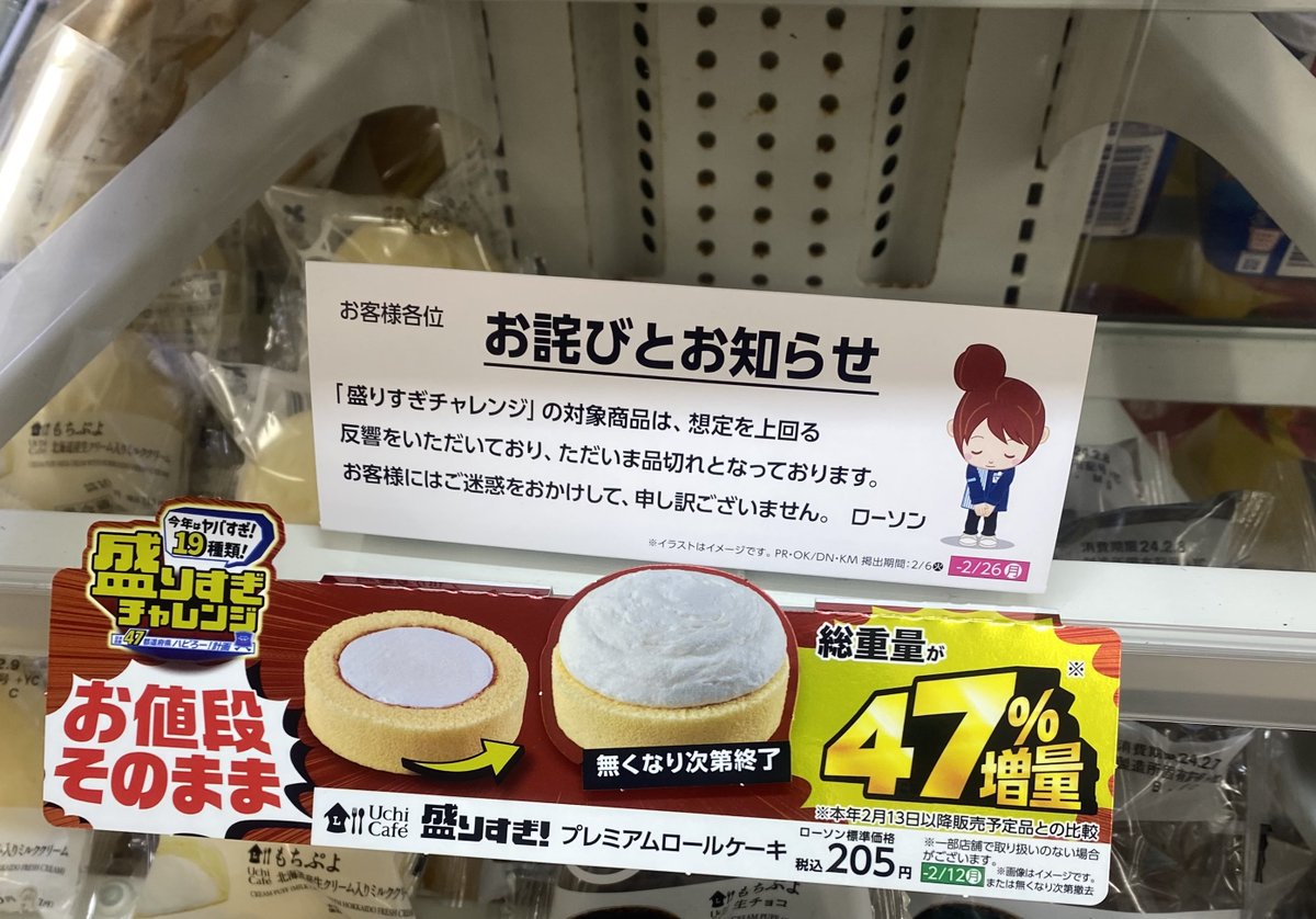 うちの近くだと盛りすぎロールケーキのときは数分で売り切れだな