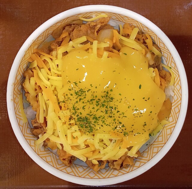 三種のチーズ牛丼特盛りでお願いします。あ、温玉もお願いします…