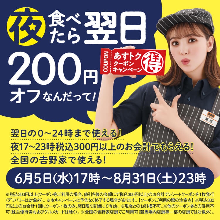 【朗報】吉野家さん、毎日食い続けると8/31まで無限に200円引き!!