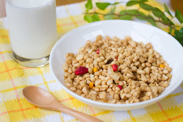 一晩何も食ってないガス欠状態だから糖質はエネルギーとしていいとしても、せめてノーマルで牛乳をかけたぐらいのたんぱく質があればなぁ