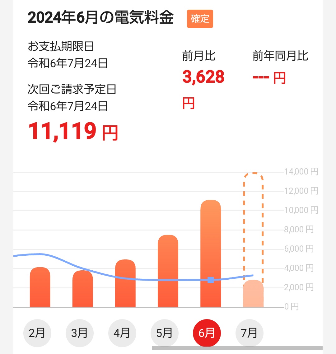 介護でほぼ1日中エアコンつけっぱなしだけどエネオス電気で6月173kwh5600円やったわ。全然ちゃうな
