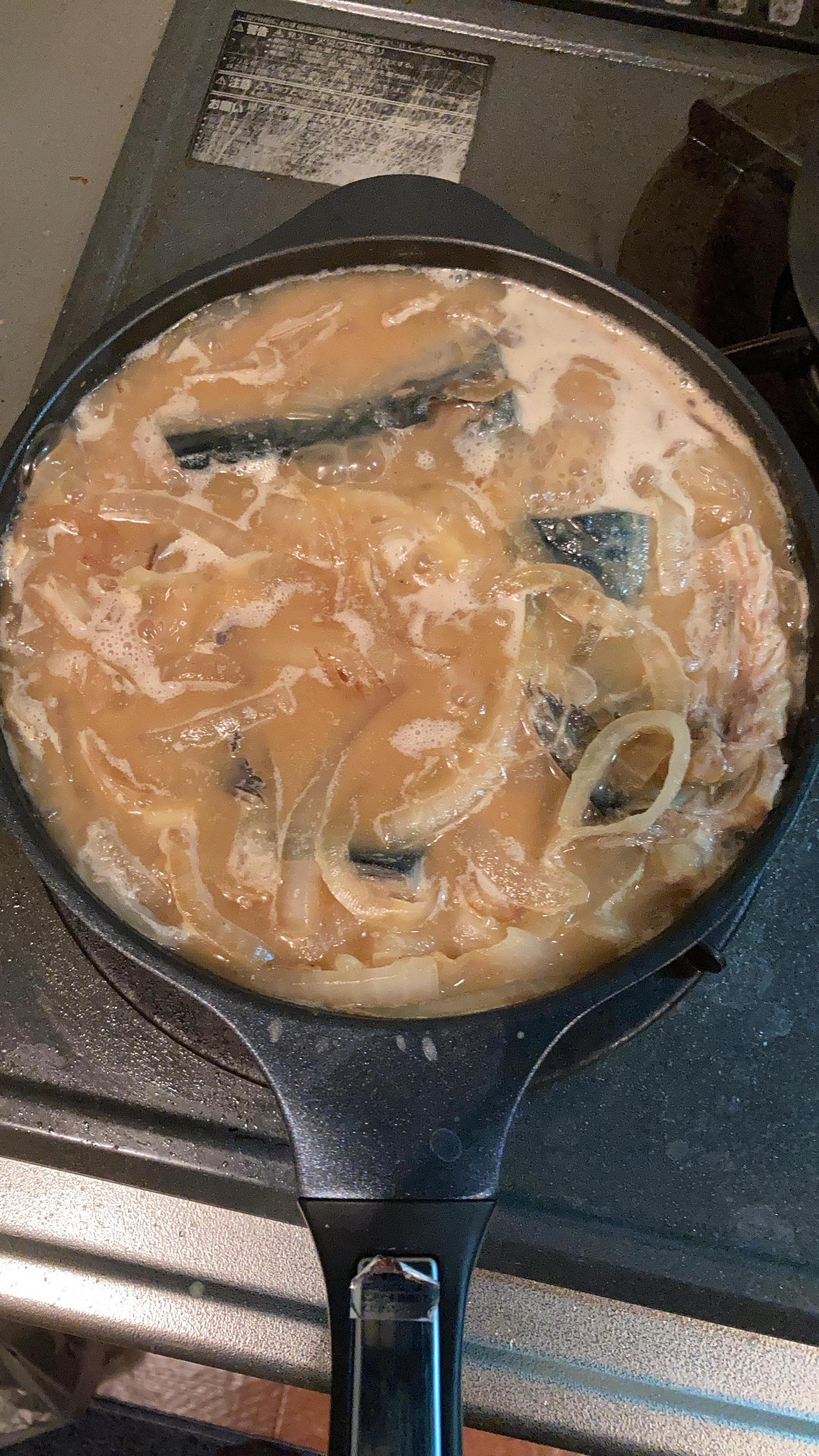 サバ缶にしちゃ生々しい色合いでアクも出てるみたいだから生サバか甘塩サバ