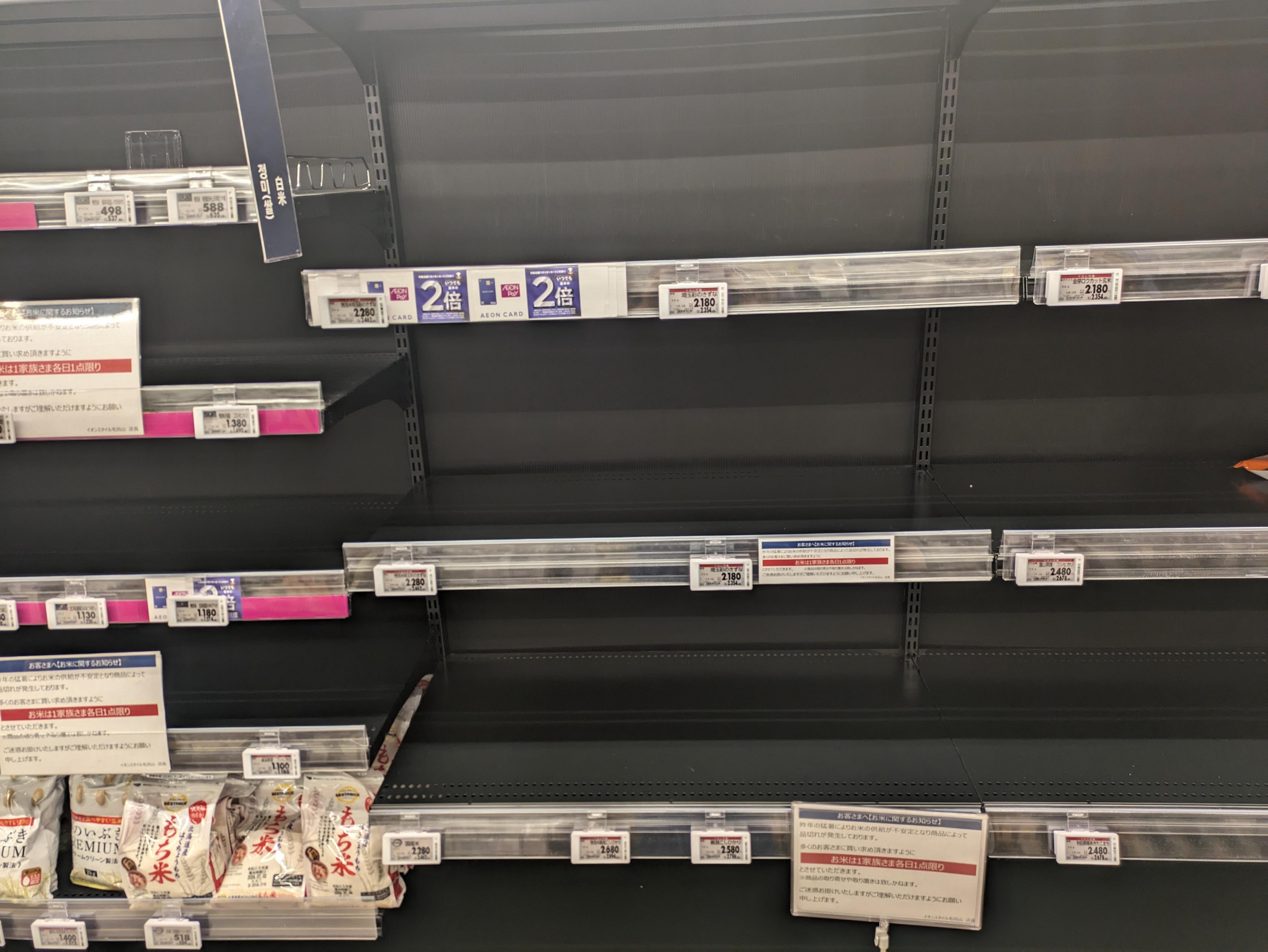 コメ入ってきてるかもしれないが、あさイチとかにいくやつらに狩られて足りてなくてすぐ売り切れになっちまうのが続いてるからなコメ