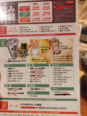 ビール付き飲み放題単体が1380円(税抜)やから