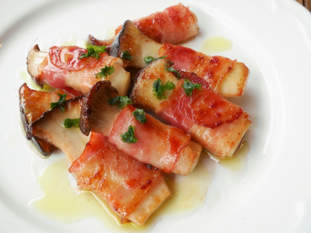 青じそに叩き梅干し巻いてベーコンでそれを巻いたりチーズ巻いたり、そういえば新宿のル・モンドのステーキ、ベーコン巻いてあるよね。