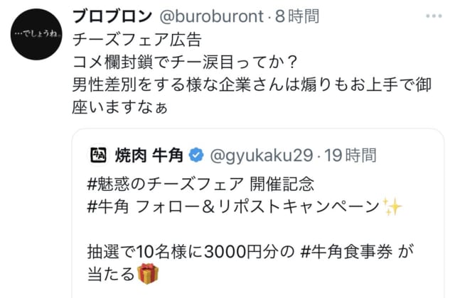 差別だろ!って叩いてるならやってる事フェミと同じだし、フェミが普段やってる事を仕返しでやってるだけだぞって奴らも何の罪もない企業を巻き込んで迷惑をかけてまで報復するのはそれはそれでやってる事フェミと同じだしね。結局頭おかしいフェミと同類の男に目付けられてしまっただけで牛角自体は何も悪くないよね
