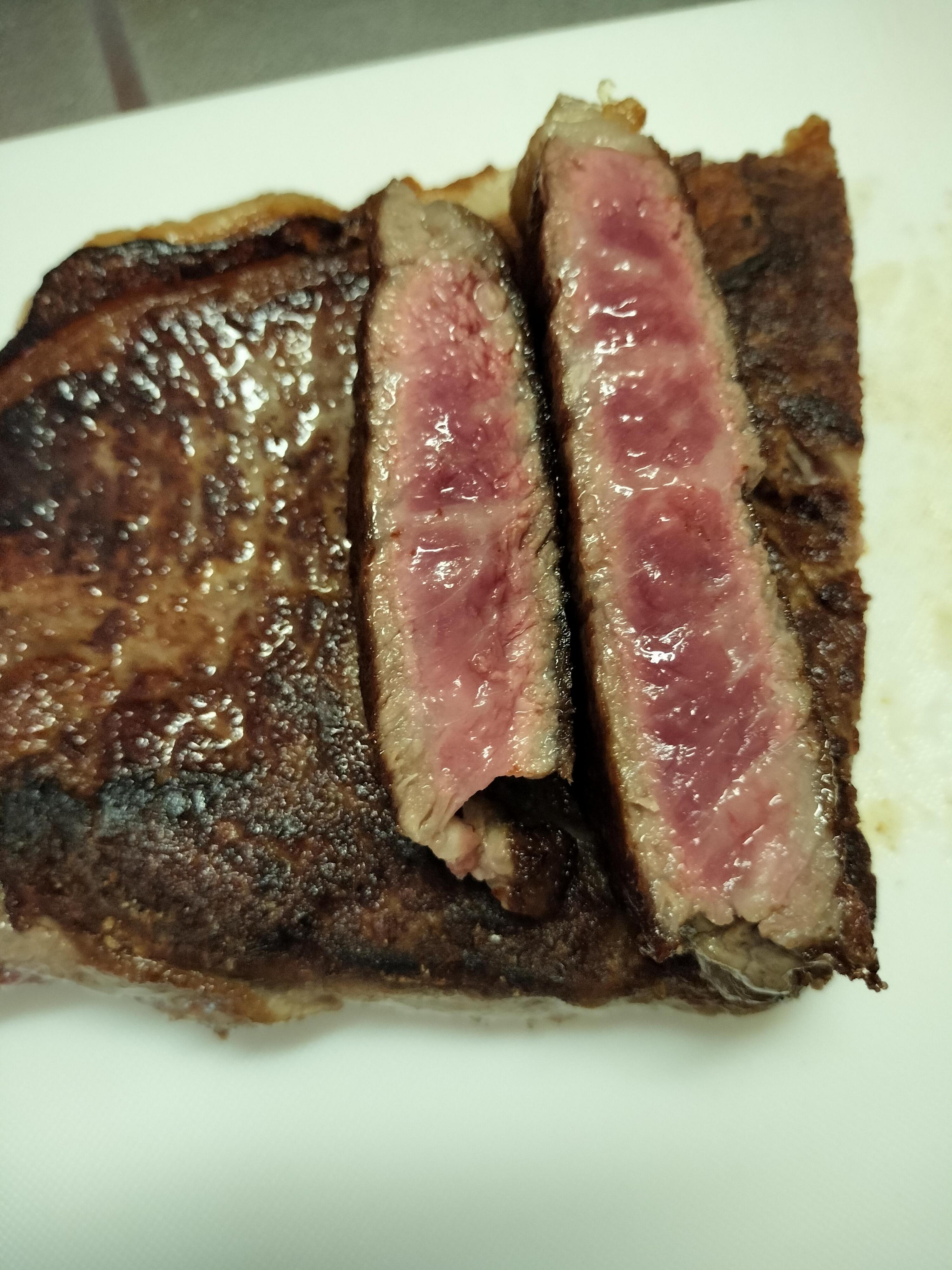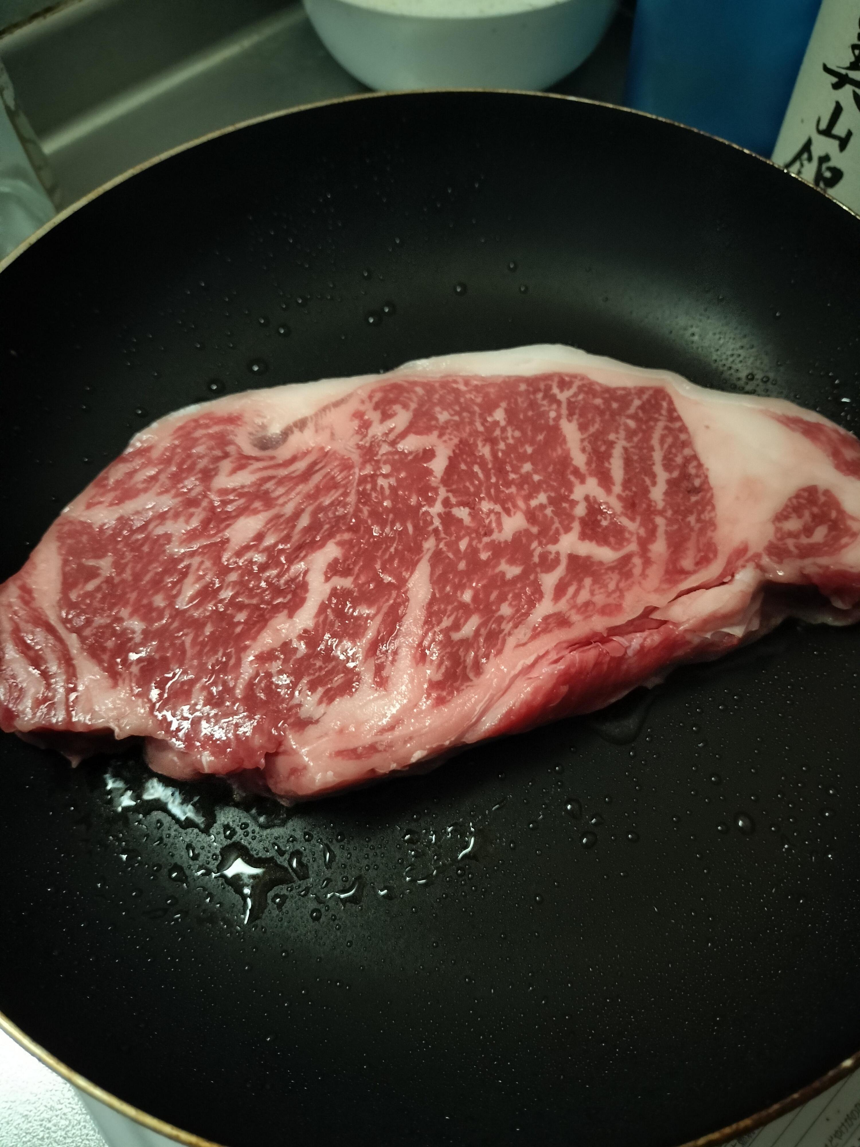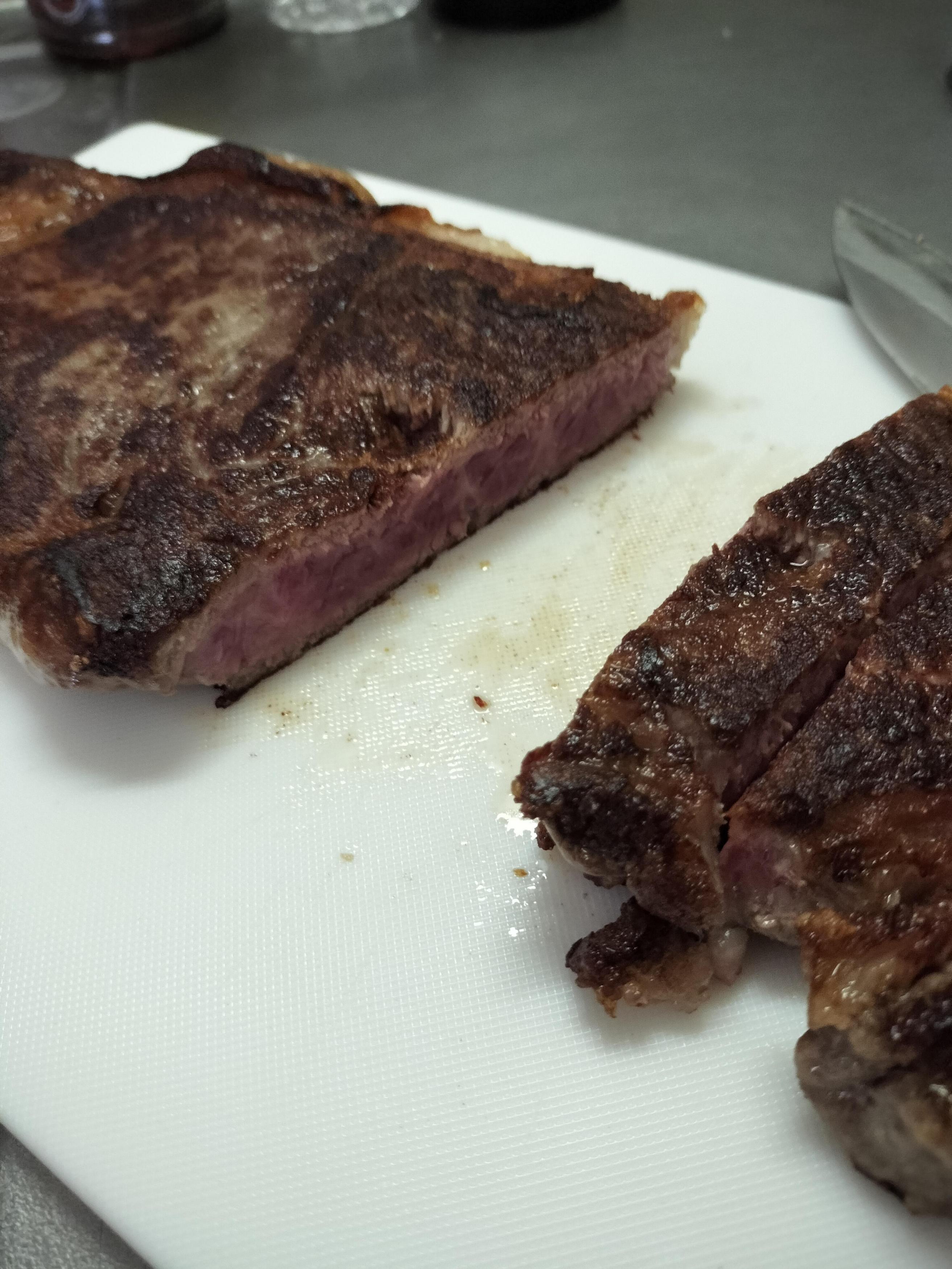 これくらいの厚みだと外側をカリカリにしてかつレア気味にするには冷蔵から直に焼かないとアカン