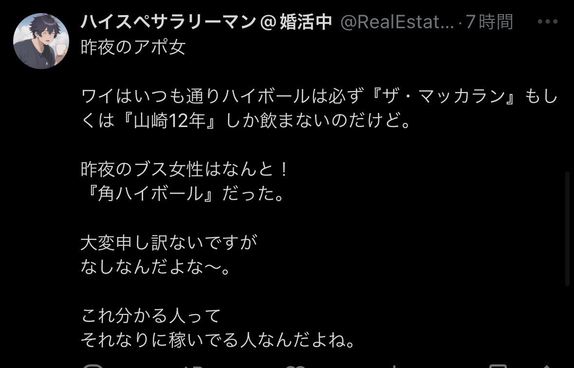 これに対するレスでマッカランはハイボールにするなとか付きまくってるけどそれはそれで何か薄っぺらいよな