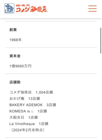 怒涛の勢いで増加中 そろそろドトールを超える見通し 店舗数 コメダ珈琲店 1004店舗 (2024年2月末時点 https://www.komeda.co.jp/company/outline.html