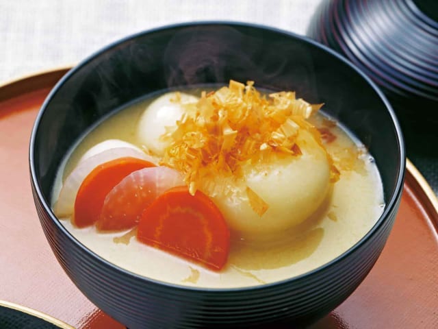 家は岐阜県民なんだが白味噌ベースで焼いた丸餅を入れる。具材は日によってまちまち。ワイは肉食えないから野菜中心になるけど。