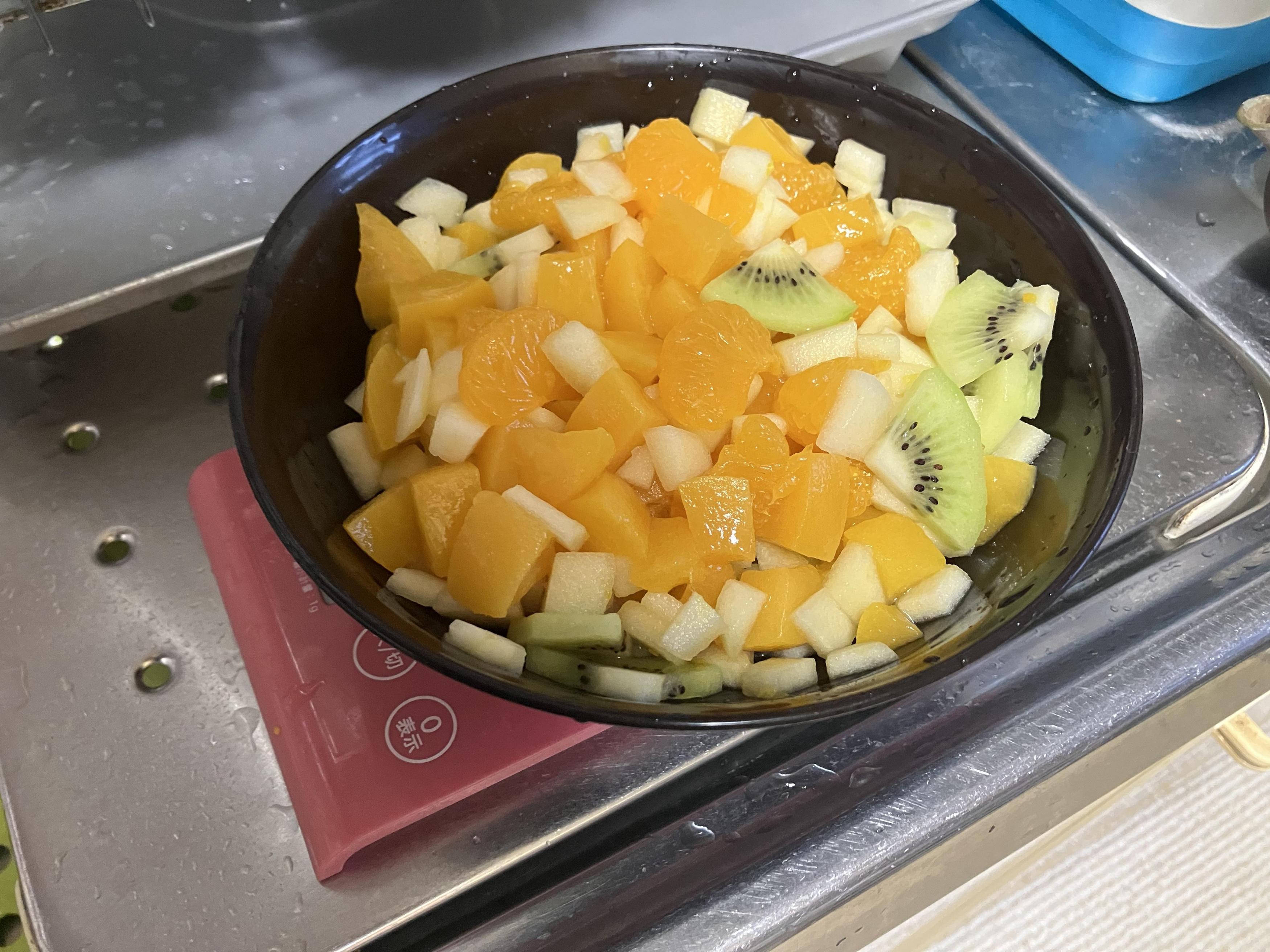 もう少し果物を大きく切るか、寒天の量増やしてしっかり目に仕上げるべきやった