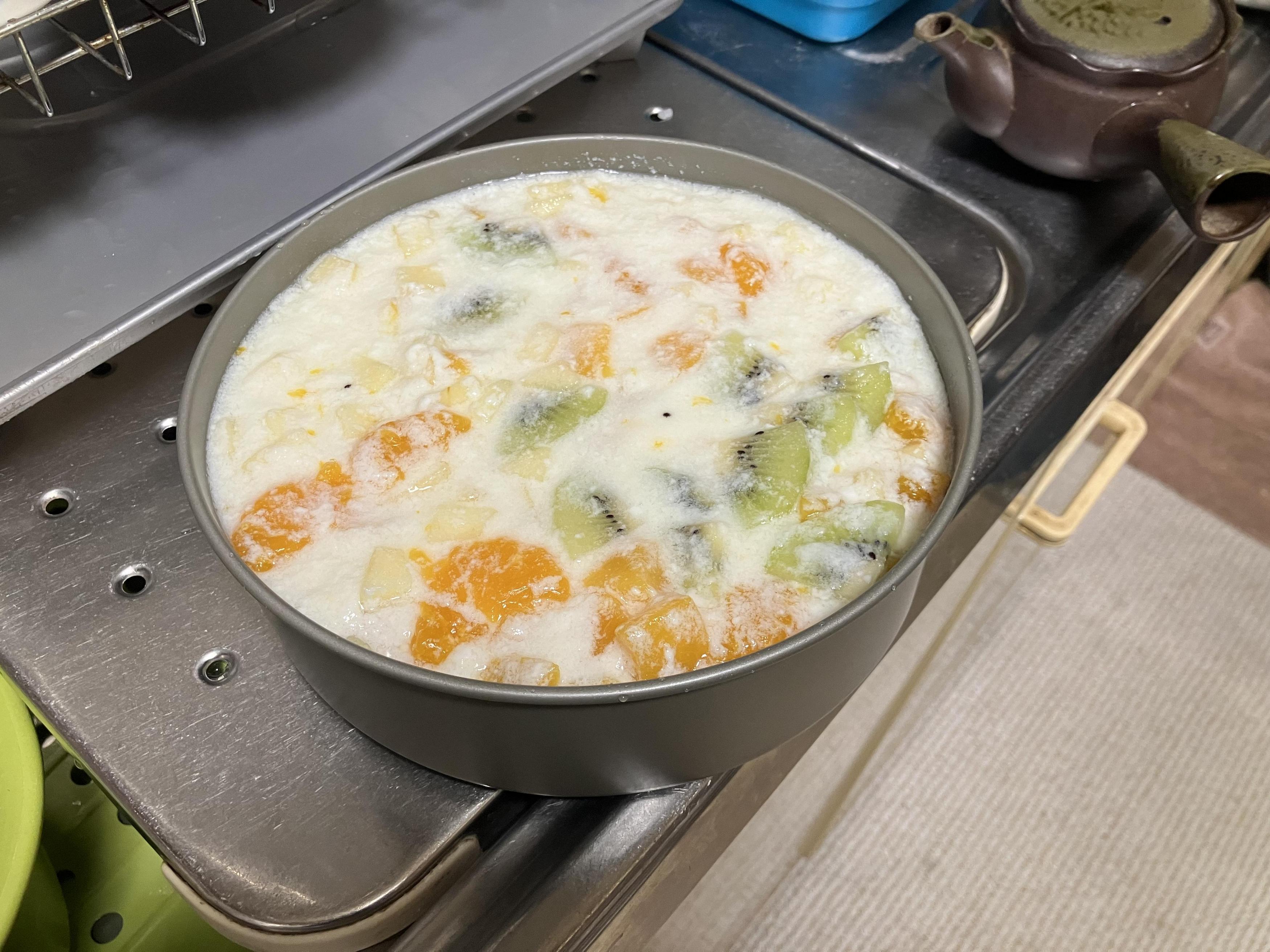 果物たっぷりと混ぜ合わせて流し込んだ部分はグズグズやん