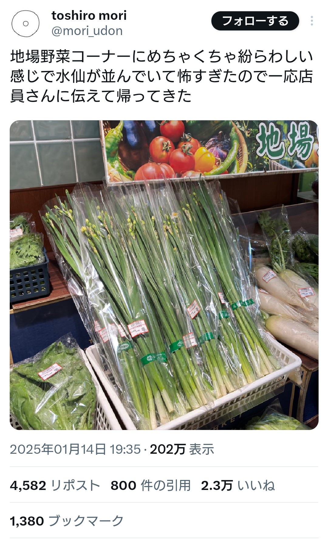 観賞用として納品されて、店員が水仙というものを知らず野菜だと思って値札つけて野菜コーナーに並べたんだよ