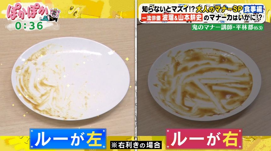 ルー右だけど半掛けになってる部分を奥から手前にクルっと掬うから画像の右のように汚くならん